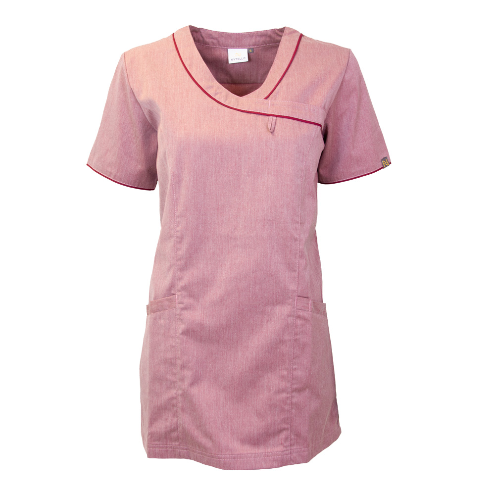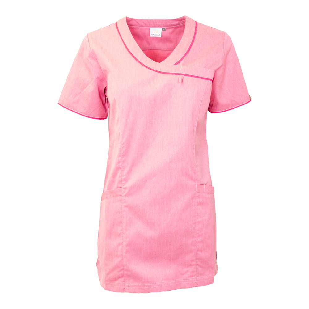 Slightly fitted model. Melange color with solid color piping. Short sleeve V-neck. Chest pocket with tassel. Two side pockets, key pocket and cell phone pocket in the right and pen pocket in the left. Slits in sides. Length center back in size M: 75 cm.