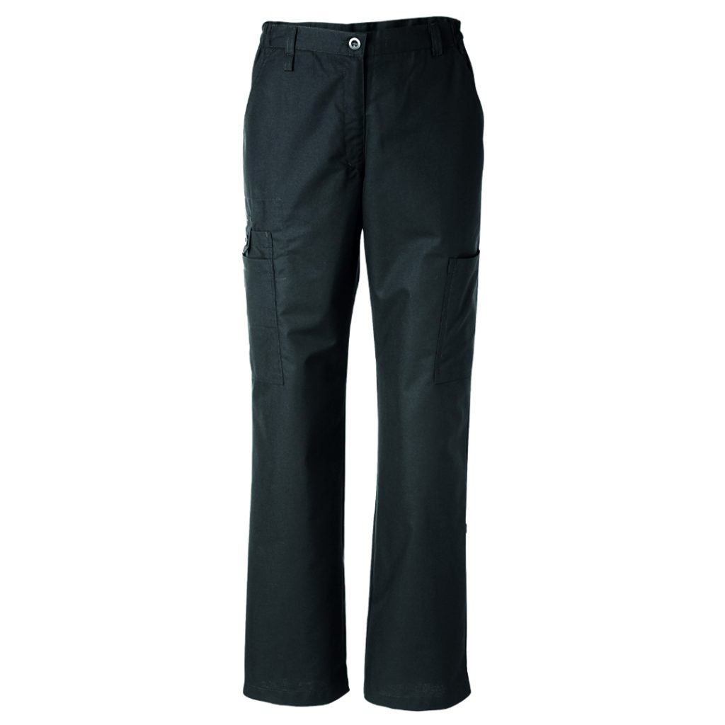 Trousers with full waistband and elasticated sides. Adjustment of waist width with button and pad. Leg pockets the right one with phone pocket that closes with button and pad. Keyhole on the right side. Leg length can be adjusted with pad and button.